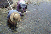 その後、およそ6尺ぐらいの繊維を 人の手によって細く裂き、太さをそろえ、これをまた、結んで長い糸にする。 織り機にかけるため ツグリ と云う、糸束にする。