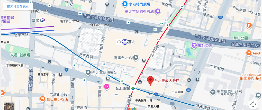 MRT台北車站(駅)下車。M3出口を上がり、左手方向に向かって進むとまもなくホテルです。